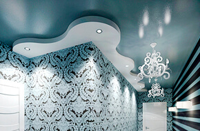 Произведем и установим потолок любого типа: от белого матового или цветного до многоуровневого потолка.